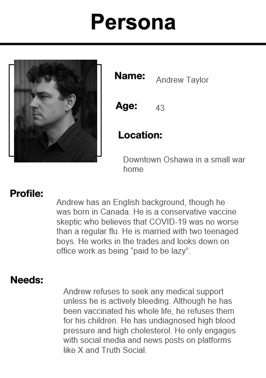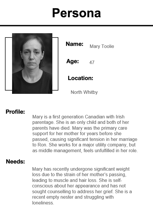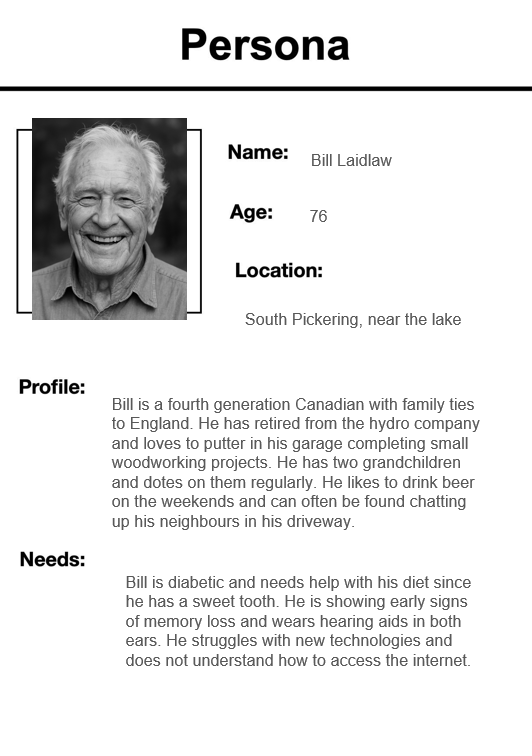 Another class exercise that I completed in my Visualization class was “ideation” – where we would work on some kind of document to apply later in our work. For instance, one of the things I worked on was the development of personas. These are basic, one page documents that outline a character that you could use in future work when you need to tailor something to a particular character. So, if I had to develop some kind of visualization in the future about a affordability in the Durham Region, I could ground the work in an existing persona to humanize the research and the story behind the output.